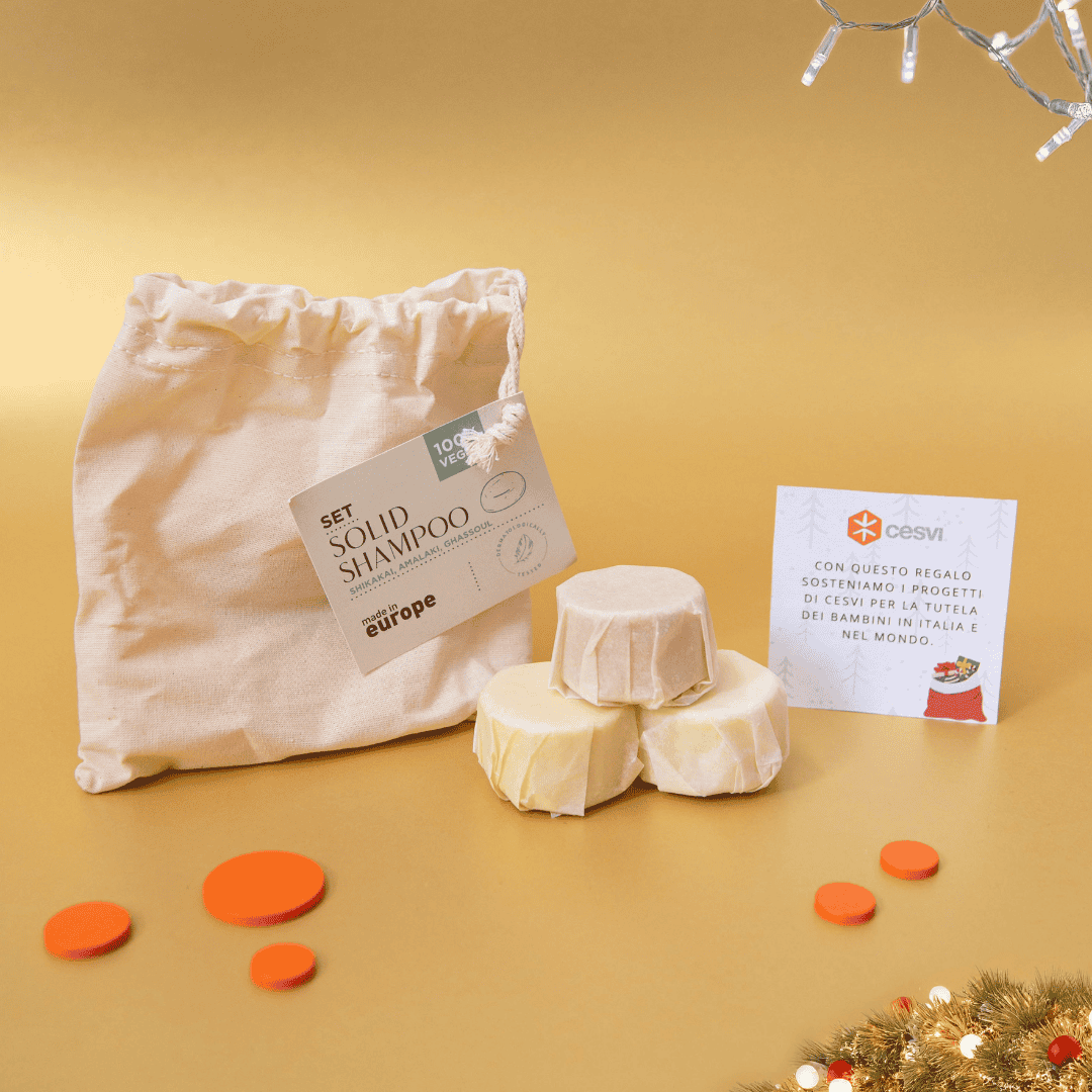 Il cofanetto regalo Kit Beauty CESVI contiene 3 shampoo solidi vegani e cruelty free: Shikakai per setosità e forza, Amalaki per idratazione e luminosità, Ghassoul per volume e brillantezza. Racchiusi in una raffinata scatola natalizia, sono custoditi in un elegante sacchetto in cotone.