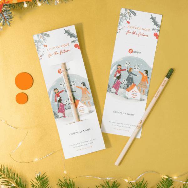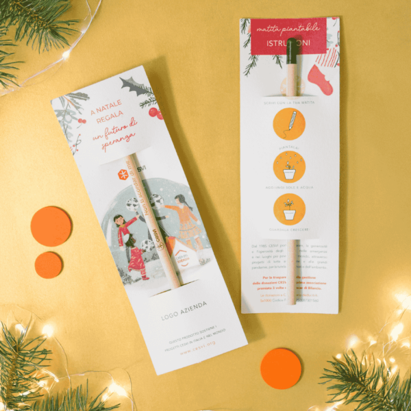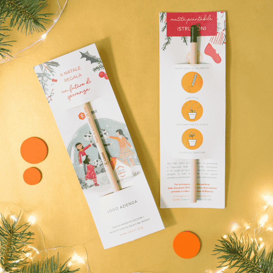 Il regalo solidale perfetto per la tua azienda: una matita piantabile che racconta l’amore della tua azienda per la natura e la volontà di sostenere CESVI. Ogni matita è un impegno concreto a favore di bambini, donne e uomini che affrontano emergenze, disastri naturali e contesti sociali difficili in tutto il mondo. Disponibili nelle versioni matita con semi di basilico e matita con semi di non ti scordar di me, per un messaggio che germoglia!