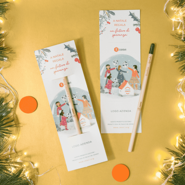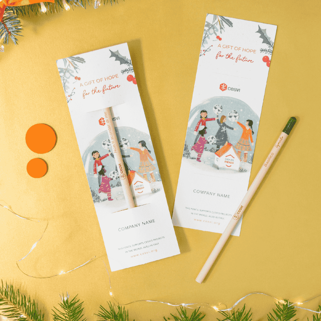 La donazione minima suggerita per le nostre matite solidali personalizzate è di 120 euro (include 20 matite con custodia, al costo di 6 euro ciascuna). Ogni matita è custodita in un astuccio in carta, personalizzabile con il nome e il logo della tua azienda. Un regalo bello e sostenibile che racconterà, anche in futuro, a dipendenti, clienti e fornitori la scelta solidale della tua azienda di essere al fianco di CESVI.